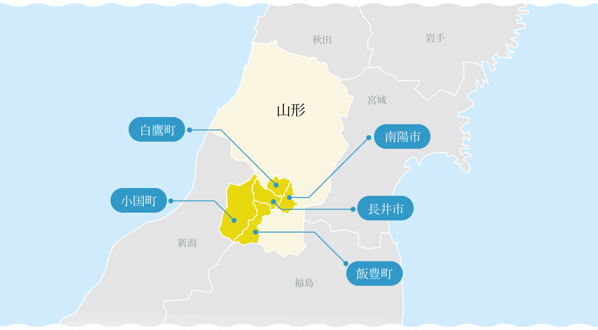 置賜地方— 長井市、南陽市、白鷹町、飯豊町、小国町。