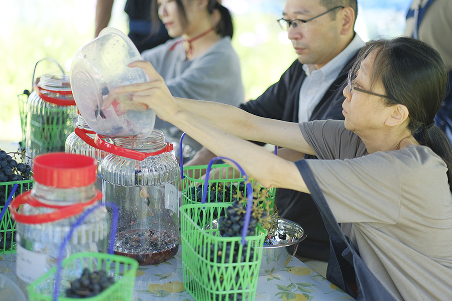 午後は柔らかな陽光を浴びる「紫金園」の葡萄棚の下、果実の甘みと未来のワインに想いを馳せる。