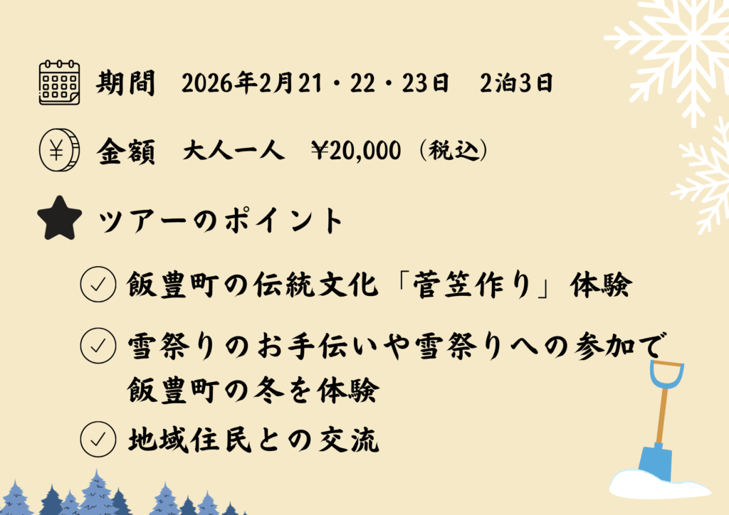 菅笠作り体験や雪祭りのお手伝いを通した地元住民との交流で、ツアー後は飯豊が第2の故郷に。飯豊町の冬の暮らしを体験してみませんか?