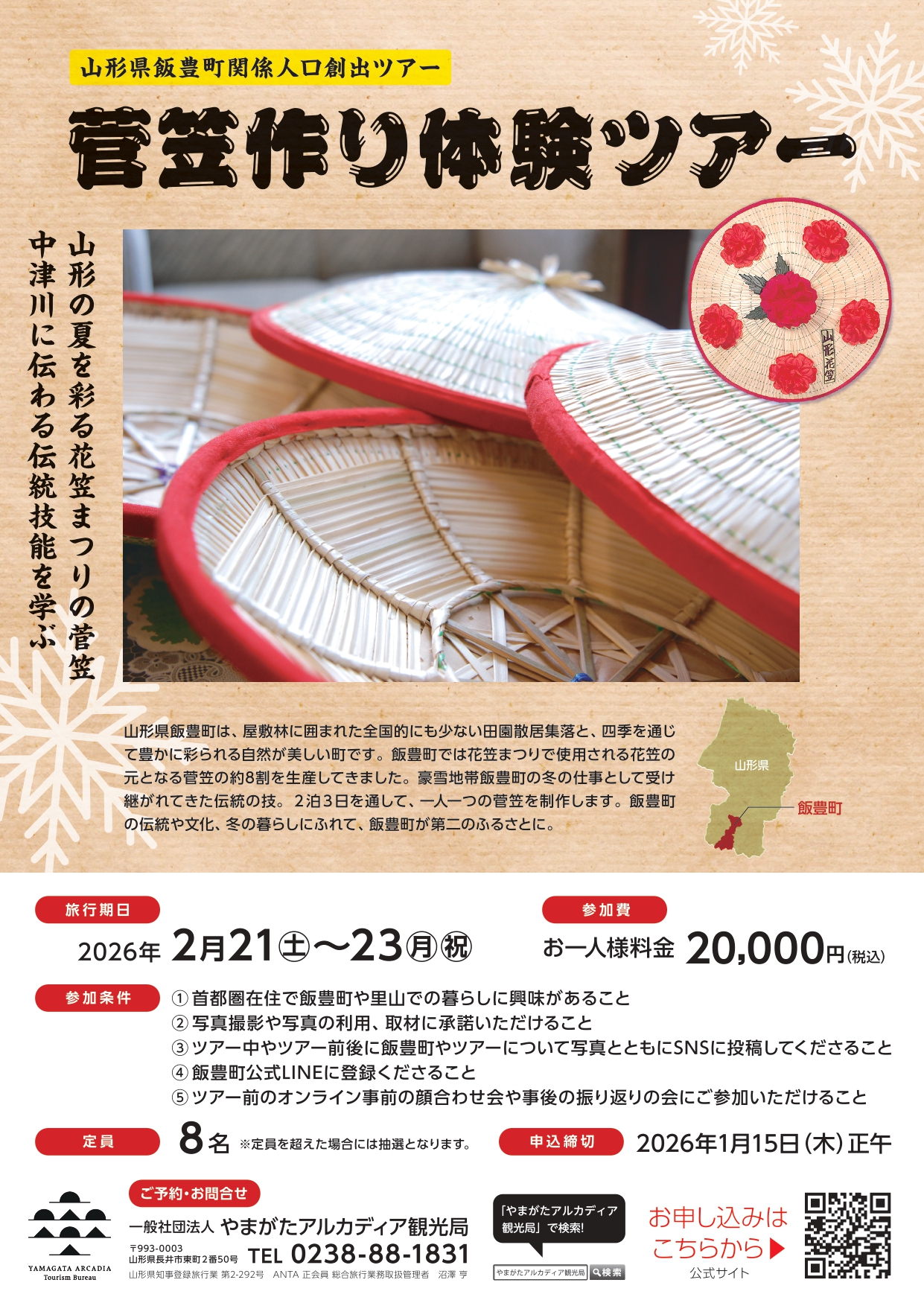 菅笠作り体験や雪祭りのお手伝いを通した地元住民との交流で、ツアー後は飯豊が第2の故郷に。飯豊町の冬の暮らしを体験してみませんか?