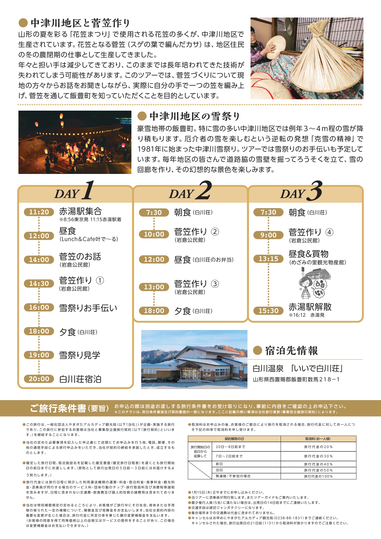 - キャンセルはお早めにやまがたアルカディア観光局(0238-88-1831)までご連絡ください。キャンセルされた場合、旅行出発日の21日前★(1/31)から取消料が掛かりますのでご注意ください。