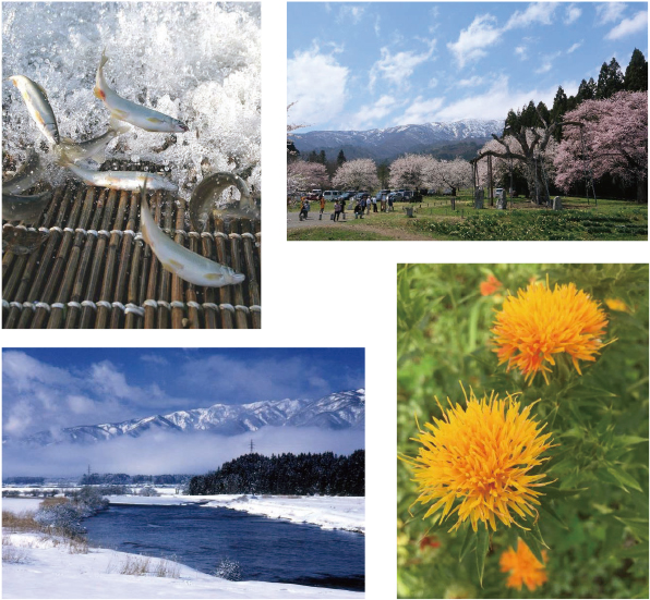 山形県白鷹町は、町の中央を最上川が流れ、西に朝日連峰、東に白鷹丘陵を望む、自然に囲まれたまち。春はサクラ、夏はベニバナ、秋はアユ、冬は隠れ蕎麦の里として、四季とともに暮らしの風景が移ろっていく町。