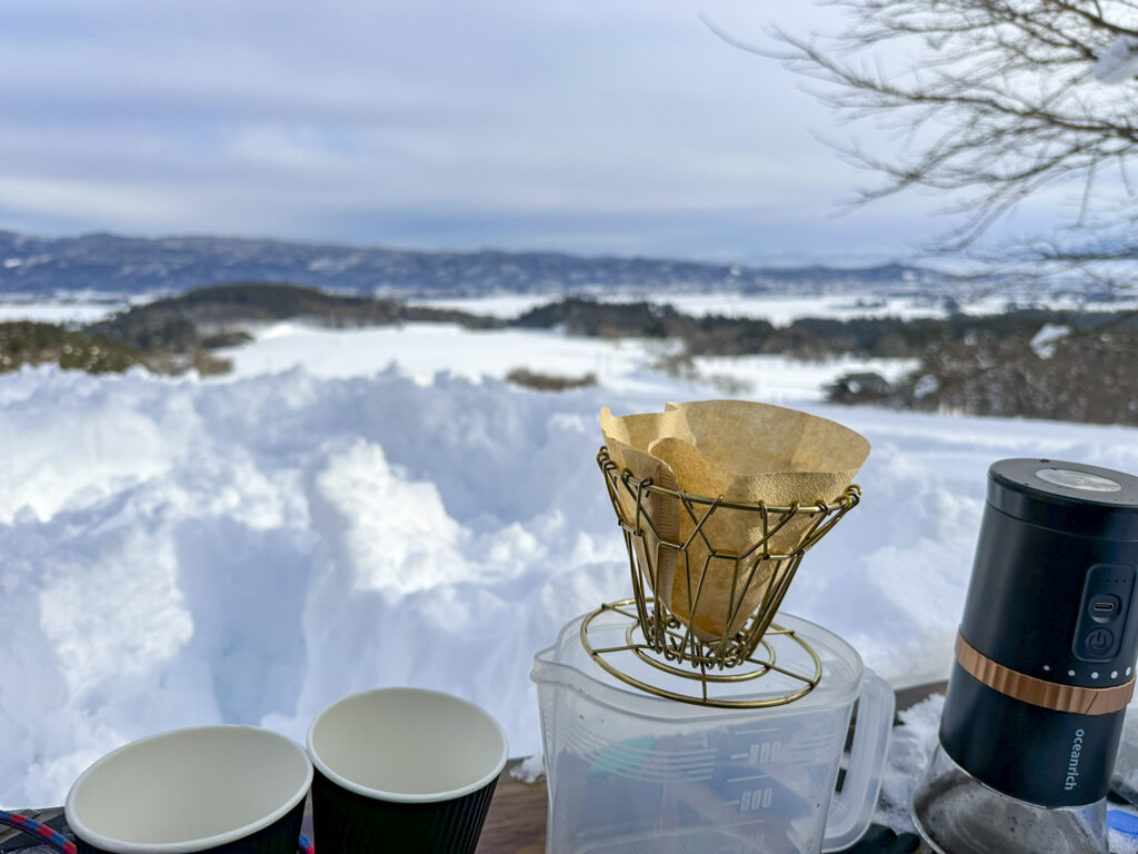 | 13:20 | ツアースタート(約120分) ●スノーシューを履いて古代の丘公園へゴー 雪が積もれば、普段は歩けないような場所も歩けるように! ●雪板体験エリアに到着したら雪板スタート スノーシューから雪板にチェンジして、誰も居ない雪原で遊ぼう! ●オリジナルブレンドコーヒー&お菓子ブレイク 地元で焙煎した【熊野山ブレンド】をお菓子とセットでご提供! コーヒー以外にココアなど甘いドリンクもご用意します。 お菓子の持ち込みもOK! |