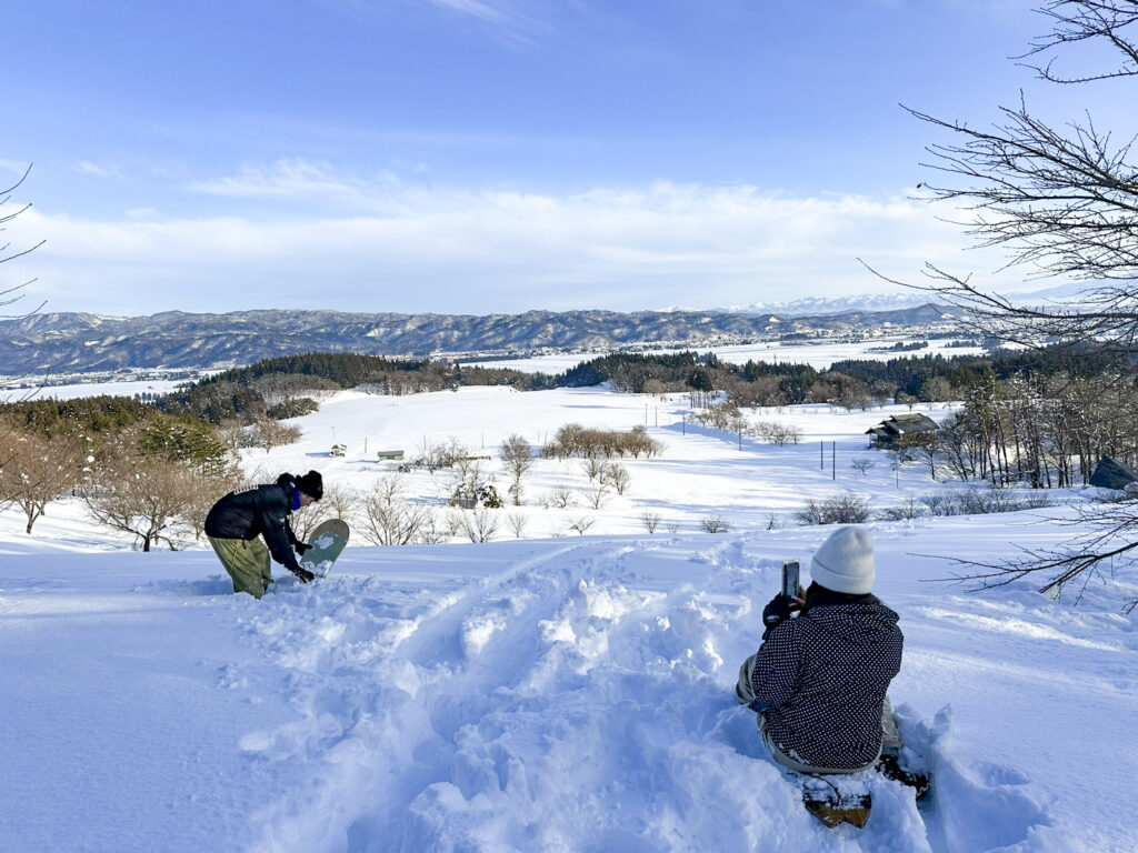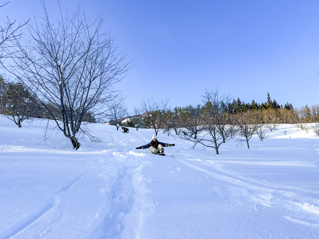 雪板体験エリアに到着後、乗り方のレクチャーを受けたらいざ雪板ライド- 身体の芯から温まる!地元のお菓子&コーヒーサービス