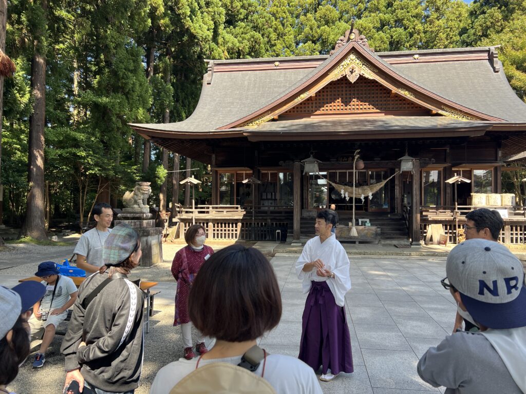 総宮神社は、11世紀に始まった黒獅子舞の発祥地。宮司の案内で神社の歴史や龍神信仰、卯の花姫伝説について学び、参拝や最古の獅子頭(1671年)を拝観できます。最後に御守りを授与。