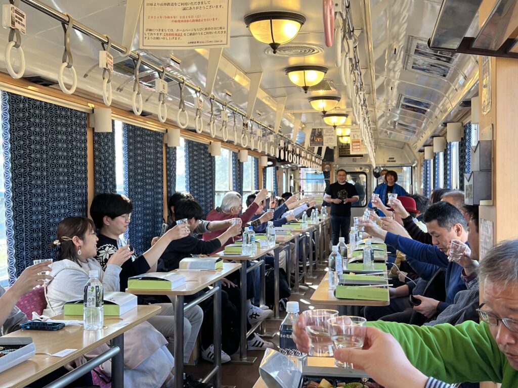 フラワー長井線 地酒列車 乾杯の様子
