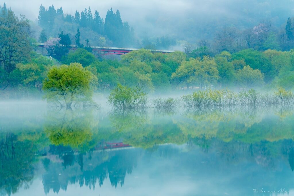 春の訪れとともに大量の雪解け水がダムに流れ込み、湖が満水となると、湖面から柳の木々がまるで「水の中から生えている」かのように立ち上がり、幻想的な「白川湖の水没林」が現れます。